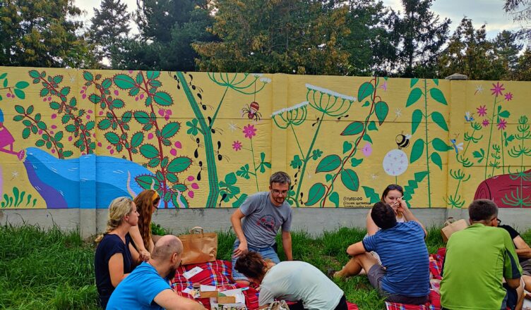 Spotkanie to było jeszcze bardziej owocne! Uczestniczyła w nim Dominika Wylezińska, która wpadła na pomysł stworzenia muralu poświęconego pszczołom, blisko naszego ogródka. Po połączeniu muralu i murarek powstał projekt „Muralki”, który wygrał Kuźnię Projektów – konkurs organizowany przez Centrum Kultury Agora. I tak patrząc bezpośrednio przed siebie z Ogrodu Społecznego można podziwiać piękny, kolorowy mural przyrodniczy.